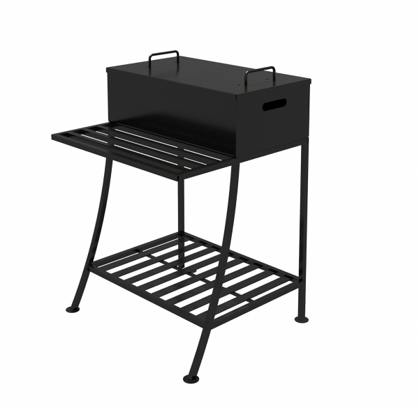Конструкция мангала оборудована двумя полками - для размещения посуды, соусов и прочих принадлежностей на верхней, и дров на нижней. Сверху на шамотный кирпич установлены П-образные профили, которые увеличивают срок службы шамотного кирпича и мангала.