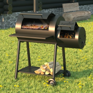 Для удобного использования на передней поверхности смокера сделана съёмная стальная полка для размещения продуктов и посуды. Смокер установлен на подставке с надёжными стальными ножками. В нижней части подставки сделана полка, на которой удобно хранить дрова и инструменты для работы со смокером. Две ножки смокера оснащены колёсами для удобства перемещения изделия по зоне барбекю. Для перекатывания смокера используется ручка на боковой стороне основного модуля смокера.