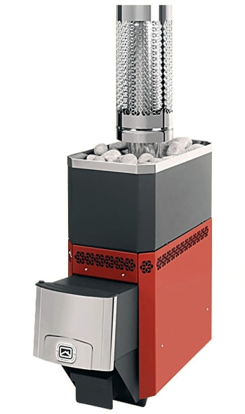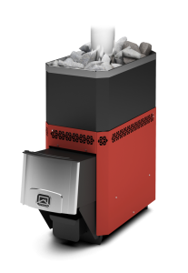 • Выход дымовой трубы смещен от края к центру каменки, что значительно упрощает монтаж дымохода.