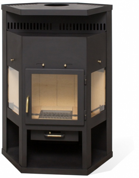 - Пристенно-угловая модель с универсальным подключением дымохода (заднее и верхнее).