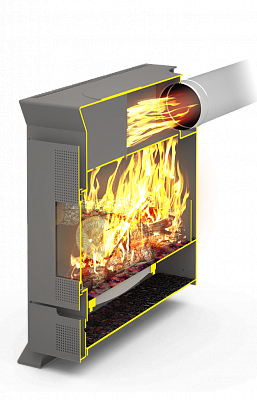 В печи реализована возможность поддержания тепла в режиме длительного горения — до 8 часов на одной закладке дров. Кожух-конвектор печи обеспечивает быстрый, равномерный нагрев помещения и защиту от жесткого инфракрасного излучения от стенок топки.