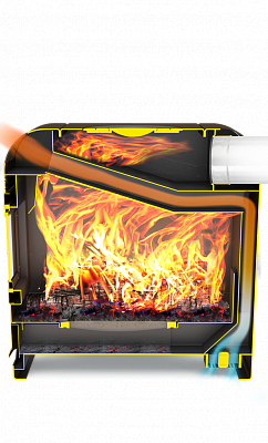 - Универсальный выход дымохода, с возможностью вывода дымовой трубы вверх или «в стену».