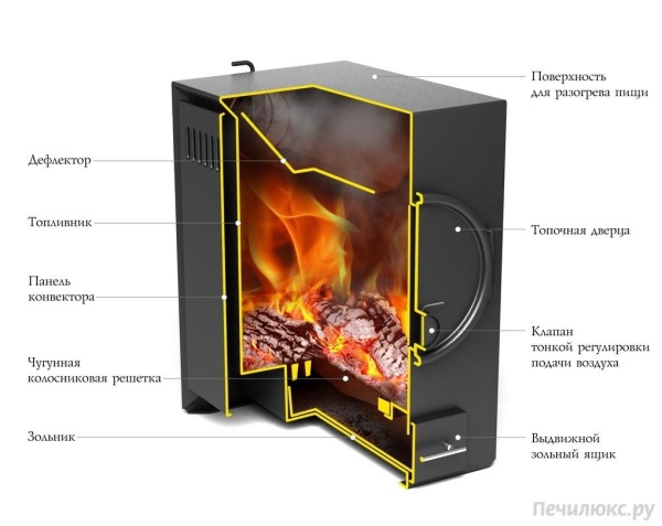 Большой герметичный топливник позволяет эффективно использовать печь в режиме длительного горения