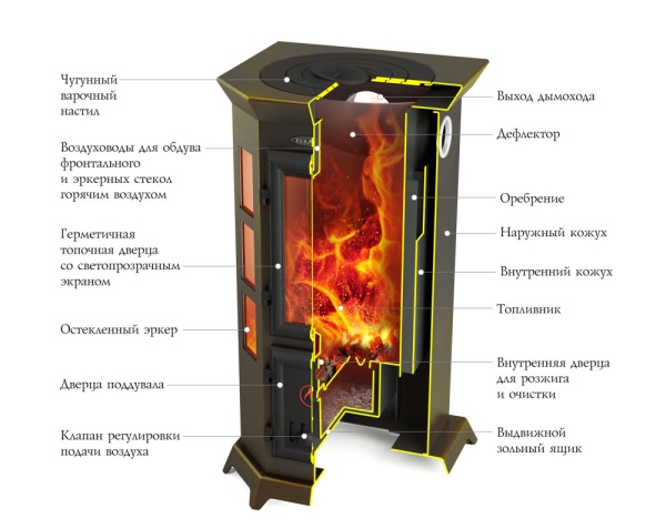 Герметичные чугунные дверцы позволяют четко контролировать интенсивность горения