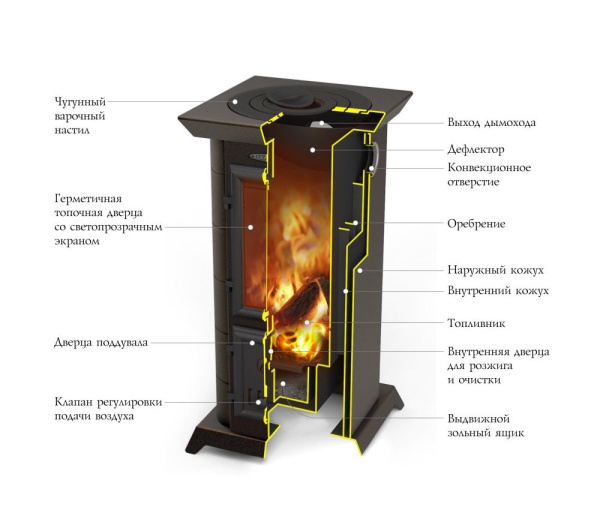Герметичные чугунные дверцы позволяют четко контролировать интенсивность горения