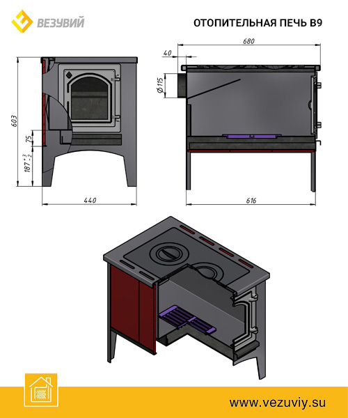 Отопительная печь Везувий В9 способна отапливать помещения объемом до 140 м3.