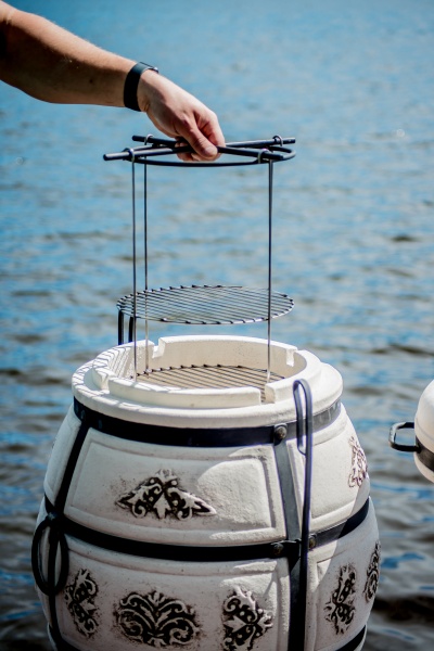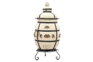 Тандыр "Александр" выполнен в виде округлого бочонка большого объёма. Тандыр имеет крышки двух уровней (колпачок и крышку). Удобно выполненный колпачок, позволяет не терять тепло при открывании тандыра. А крышка с удобными ручками позволяет легко открывать тандыр и закладывать в него продукты для приготовления. Кованная подставка - ножки обеспечивает удобное использование тандыра. Красоту тандыру придаёт интересный орнаментальный растительный узор, расположенный в центральной его части. Керамический тандыр в основном выполнен в бежевом цвете, коричневый цвет добавлен в области орнамента. На поверхность орнамента нанесена глазурь, которая защищает его от влаги и грязи. Изготовленный из шамотной глины высокотемпературного обжига он обладает высокой теплопроводностью, экологичностью, прочность и долговечностью более 10 лет.