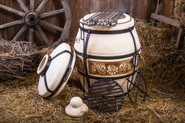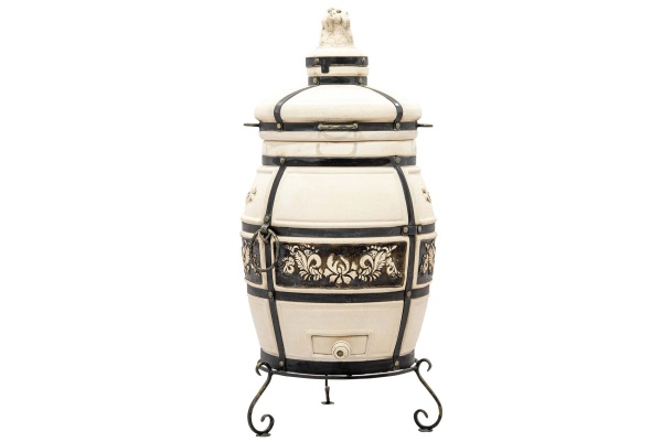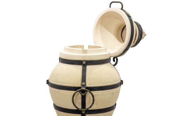 Тандыр "Казачий" выполнен в виде округлого бочонка большого объёма. Тандыр имеет крышки двух уровней (колпачок и крышку). Удобно выполненный колпачок, позволяет не терять тепло при открывании тандыра. А крышка с удобными ручками позволяет легко открывать тандыр и закладывать в него продукты для приготовления. Кованная подставка - ножки обеспечивает удобное использование тандыра. Красоту тандыру придаёт интересный орнаментальный растительный узор, расположенный в центральной его части. Керамический тандыр в основном выполнен в бежевом цвете, коричневый цвет добавлен в области орнамента. На поверхность орнамента нанесена глазурь, которая защищает его от влаги и грязи. Изготовленный из шамотной глины высокотемпературного обжига он обладает высокой теплопроводностью, экологичностью, прочность и долговечностью более 10 лет.
